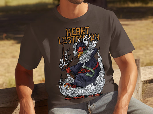 Heart Illustration the Mountain Watcher Japanese Tengu Art T-Shirt, Cool Mythical Creature Graphic Tee for Fans, Unique Artistic Apparel