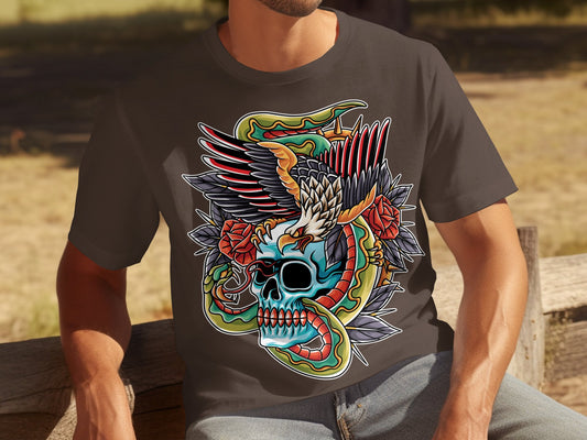 Skull and Eagle with Roses and Serpent Graphic T-Shirt, Cool Skull Art Tee, Retro Skull Tattoo T-Shirt, Bold Graphic Print Shirt