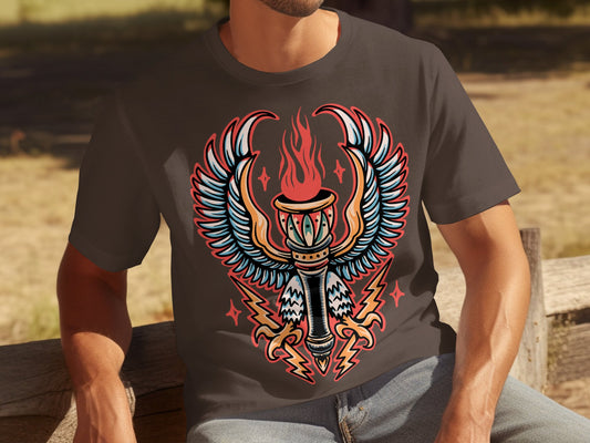 Unique Flame Winged Torch Design T-Shirt, Intricate Tribal Art Tee, Mythical Symbol Apparel, Bold Graphic Tee, Eye-Catching Design