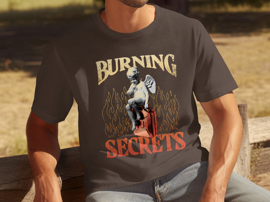 Burning Secrets Angel Graphic Tee, Retro Aesthetic T-Shirt, Vintage Style Angel Design, Fire Inspired Artwork Shirt, Unique Casual Wear