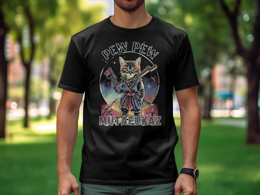 Cat Ninja Samurai T-Shirt, Pew Pew MUTAFUKAZ Graphic Tee, Cosmic Kitty Warrior, Funny Cat Lover Gift, Unisex Apparel
