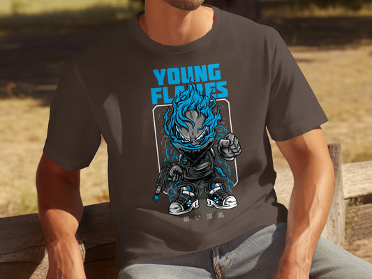 Young Flames Graphic T-Shirt, Unique Streetwear Design, Cool Blue Flame Character, Trendy Urban Wear, Men Women Teens Stylish Tee