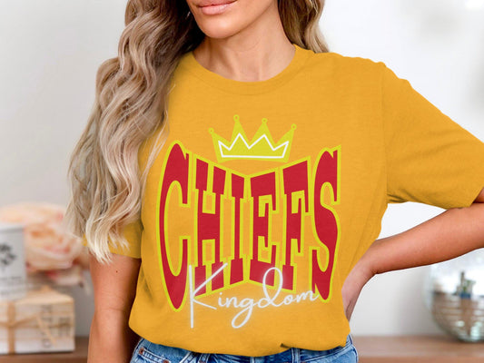 Chiefs Kingdom T-Shirt, Bold Graphic Print Tee, Novelty Shirt, Red and Yellow Crown Design, Statement Sportswear Top