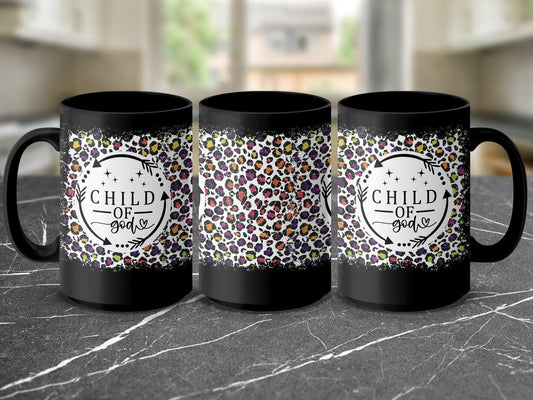 Child of God Mug, Colorful Leopard Print Coffee Cup, Inspirational Quote Mug, Unique Gift for Christians, Faith Themed Cup