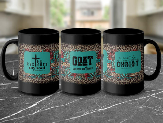 Christian Bible Verse Mug, Inspirational Coffee Cup, Psalm 13 3, Philippians 4 13, Goat God Over All Things, Leopard Print