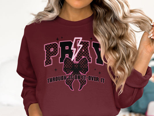Graphic Tee Shirt Pray Through It On It Over It Bow Lightning Design Trendy Casual Top Inspirational Quote TShirt Gift Idea
