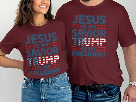 Jesus Is My Savior Trump Is My President T-Shirt, Patriotic Christian Faith Shirt, Bold Statement Graphic Tee, USA Flag Print Top