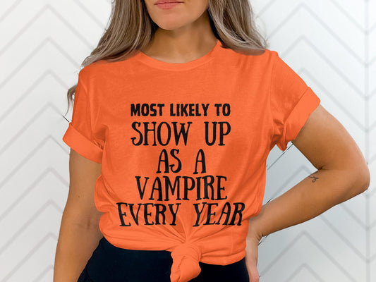 Most Likely to Show Up as a Vampire Every Year Halloween Shirt, Funny Halloween Costume T-Shirt, Vampire Lover Shirt, Halloween Tee