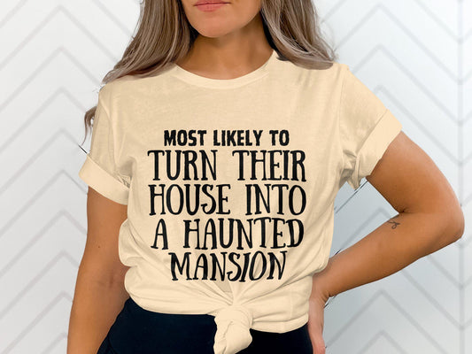 Most Likely To Turn Their House Into A Haunted Mansion Funny Halloween T-Shirt, Spooky Graphic Tee, Halloween Party Shirt, Ghost Lover Top