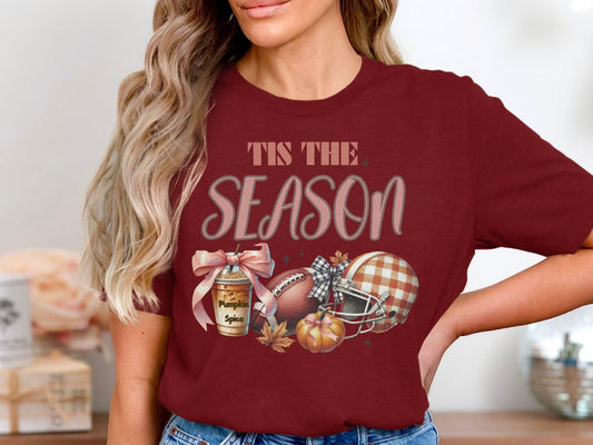 Cute Fall Football and Pumpkin Spice Tis The Season Graphic Tee, Cozy Autumn Shirt, Trendy Fall Tee, Perfect For Fall Lovers