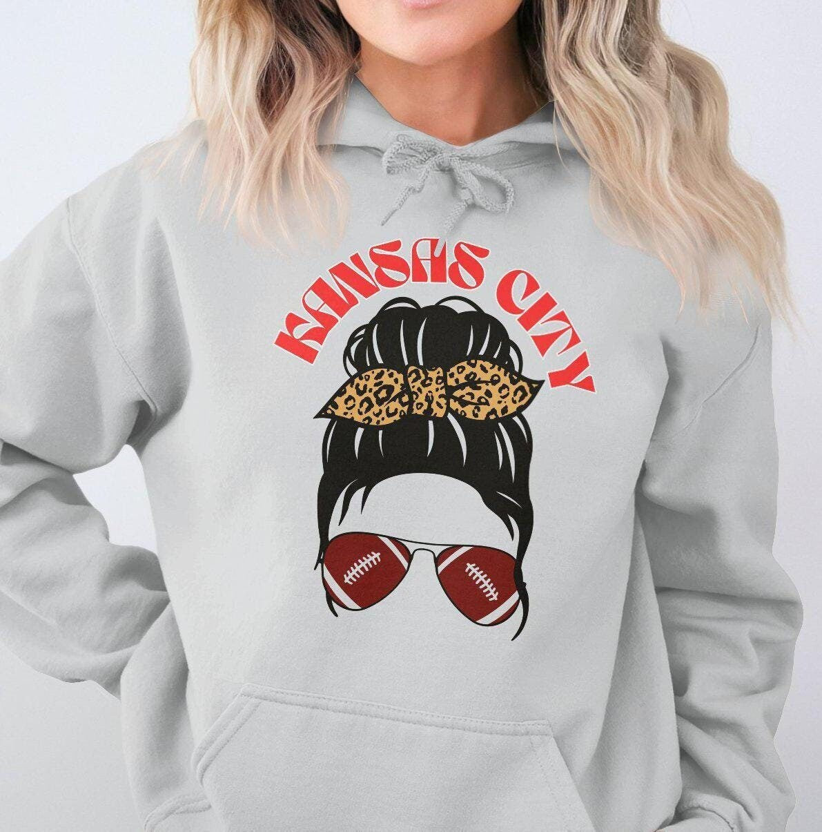 Show off your Kansas City pride with this unique T-Shirt featuring a trendy graphic design. The shirt showcases a stylish woman wearing a leopard print headband and football sunglasses, making it the perfect addition to your game day outfit. Whether at the stadium or watching from home, this tee is sure to make a statement. Comfortable and fashionable, it’s a must-have for any Kansas City football fan. Great as a gift or for yourself, wear it to cheer on your team in style!