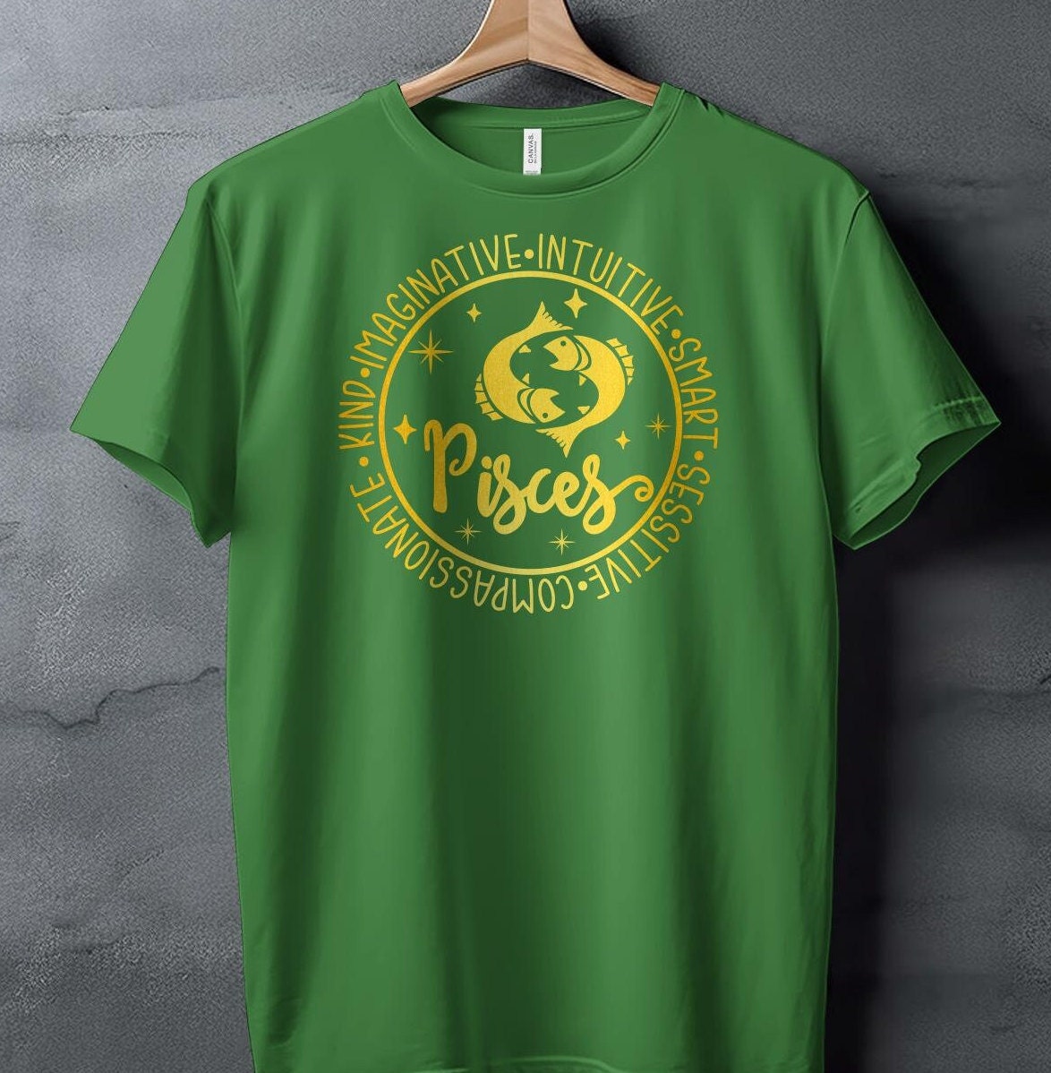 Celebrate your astrological sign with this Pisces Zodiac Sign T-Shirt featuring a beautiful gold Pisces fish design. Perfect for astrology enthusiasts, this horoscope shirt makes a fantastic gift or a stylish addition to your wardrobe. Express your imaginative and compassionate nature with this unique zodiac constellation art piece. Whether for daily wear or special occasions, showcase your star sign with pride in this comfortable and eye-catching t-shirt.